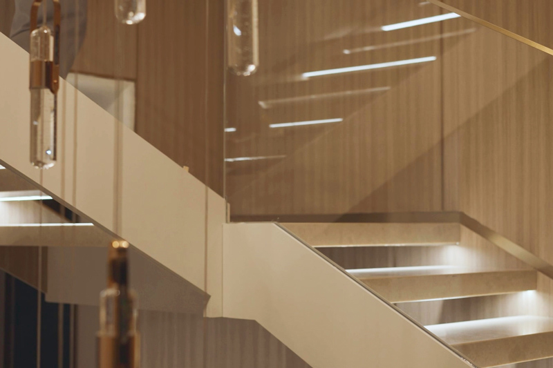 跟隨生活場景隨心調(diào)配燈光,中餐模式、西餐模式、會客模式、品茗模式......即使是同一個空間,也能營造出不同的氛圍感貫徹一層負一層空間的踏步燈帶旋轉(zhuǎn)梯,燈隨人亮,靈動智能,上下樓都有了別樣的趣味