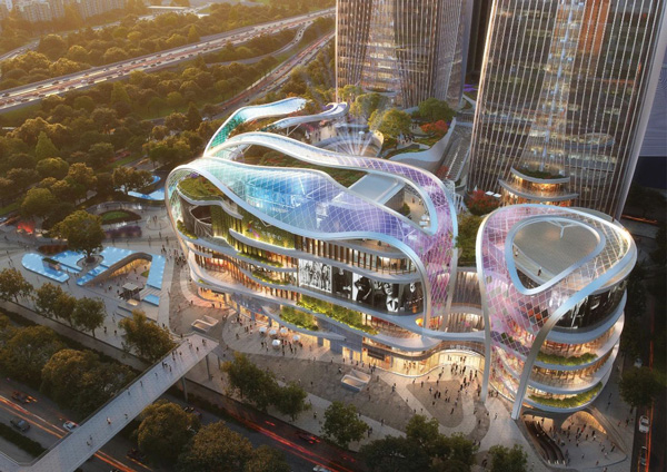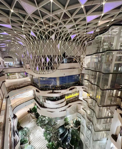 形如花瓣的商業(yè)中心裙房樂薈中心,有西北最大的室內綠色生態(tài)疊水景觀和高達36m的巨型水晶瀑布,是集四季、山水、綠植、花香、蟲鳴、鳥叫為一體的“森林氧吧”。在夜景泛光照明的烘托下,南飛鴻充分展現創(chuàng)新型商業(yè)綜合體的獨特氣質,拔高城市居民審美的同時,也刷新著西安商業(yè)的新高度。