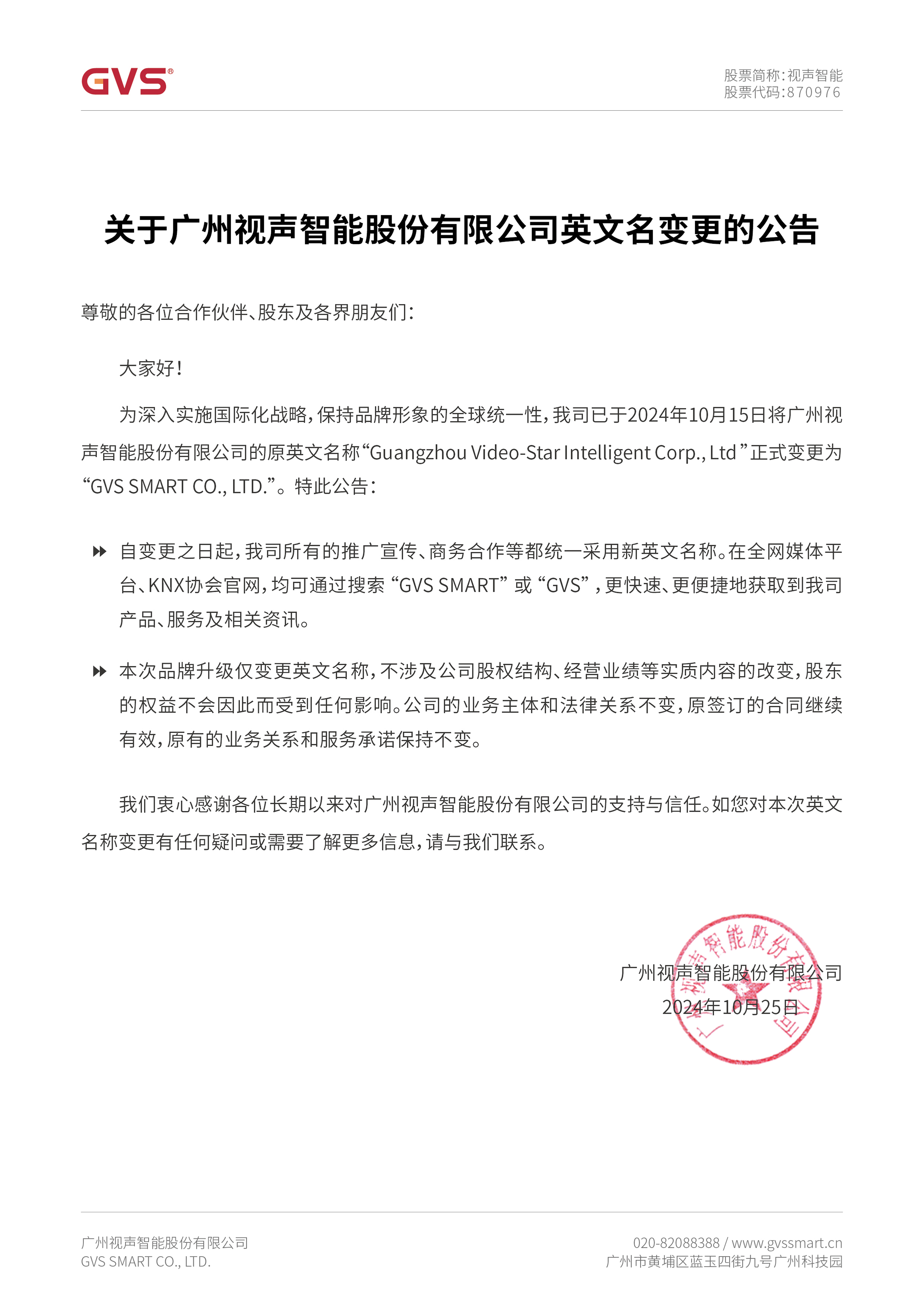 重要公告:廣州視聲智能股份有限公司英文名已變更為“GVS SMART CO., LTD.”。新名稱更簡潔,品牌形象全球統(tǒng)一,大家在全網(wǎng)平臺直接搜索“GVS SMART”或“GVS”就能快速找到我們哦~