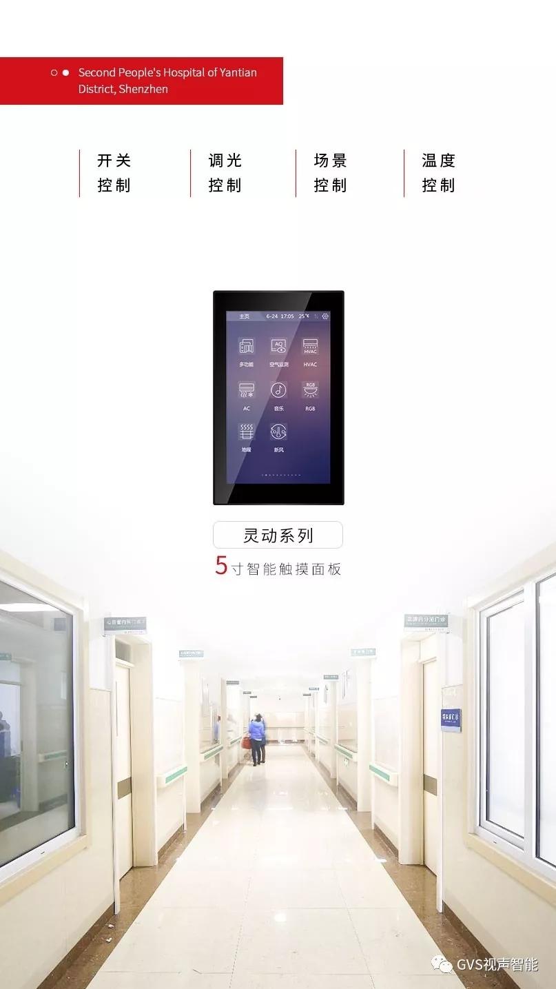 因此,院方工作人員不再需要逐個打開/關(guān)閉住院部公共區(qū)域燈具,僅僅通過在走廊設(shè)置GVS簡系列86智能按鍵面板、在護士站搭載GVS靈動系列5寸智能觸摸面板,就可以一鍵控制住院部公共過道的燈光。