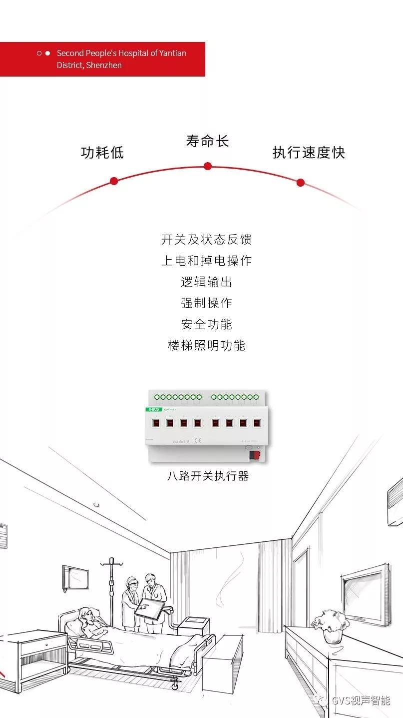 結(jié)合醫(yī)院實際情況,GVS視聲還為項目搭載了基于KNX協(xié)議的GVS八路開關(guān)執(zhí)行器、總線電源、線路耦合器等產(chǎn)品。