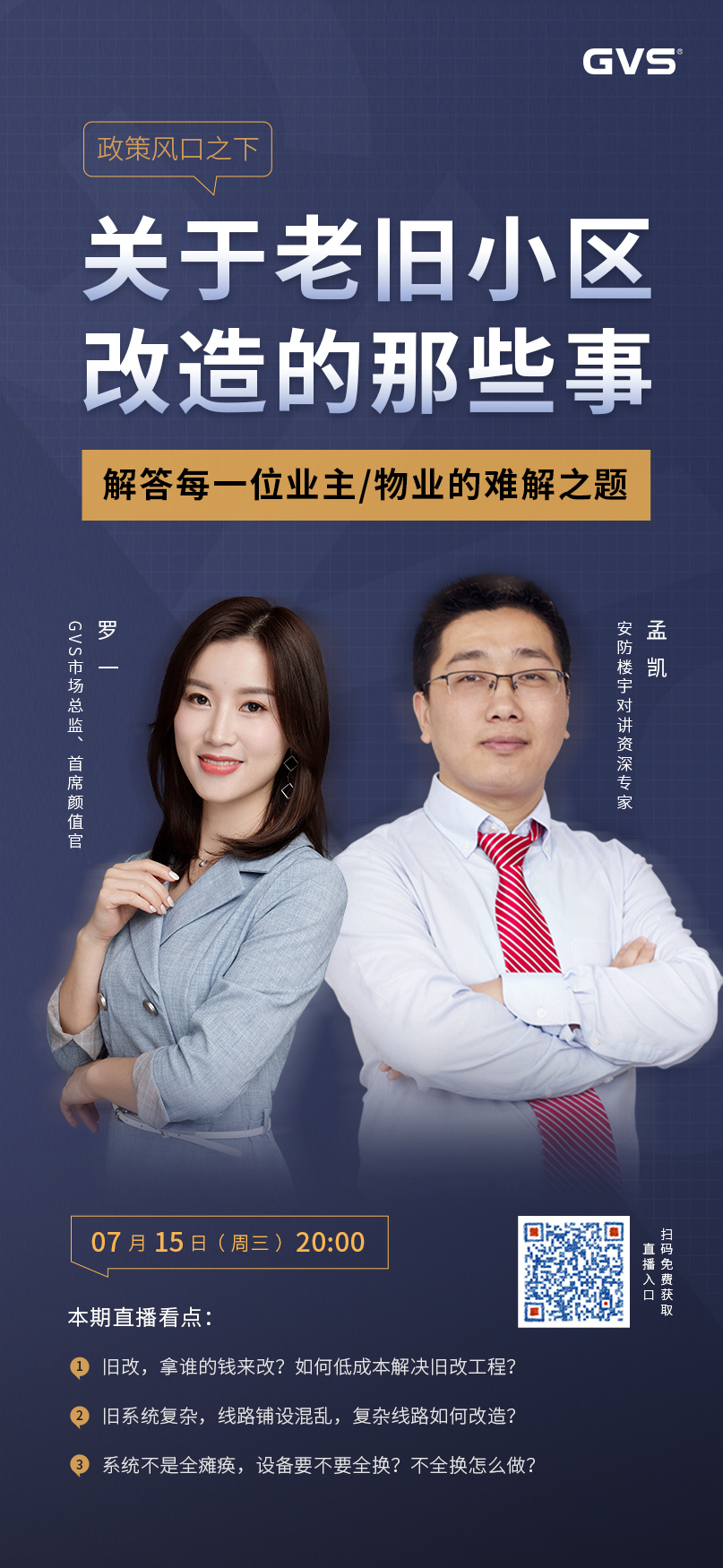 715日晚上8點(diǎn),GVS視聲首席顏值官羅一,攜手安防樓宇對(duì)講資深專(zhuān)家孟凱老師,帶你解碼老舊小區(qū)改造。