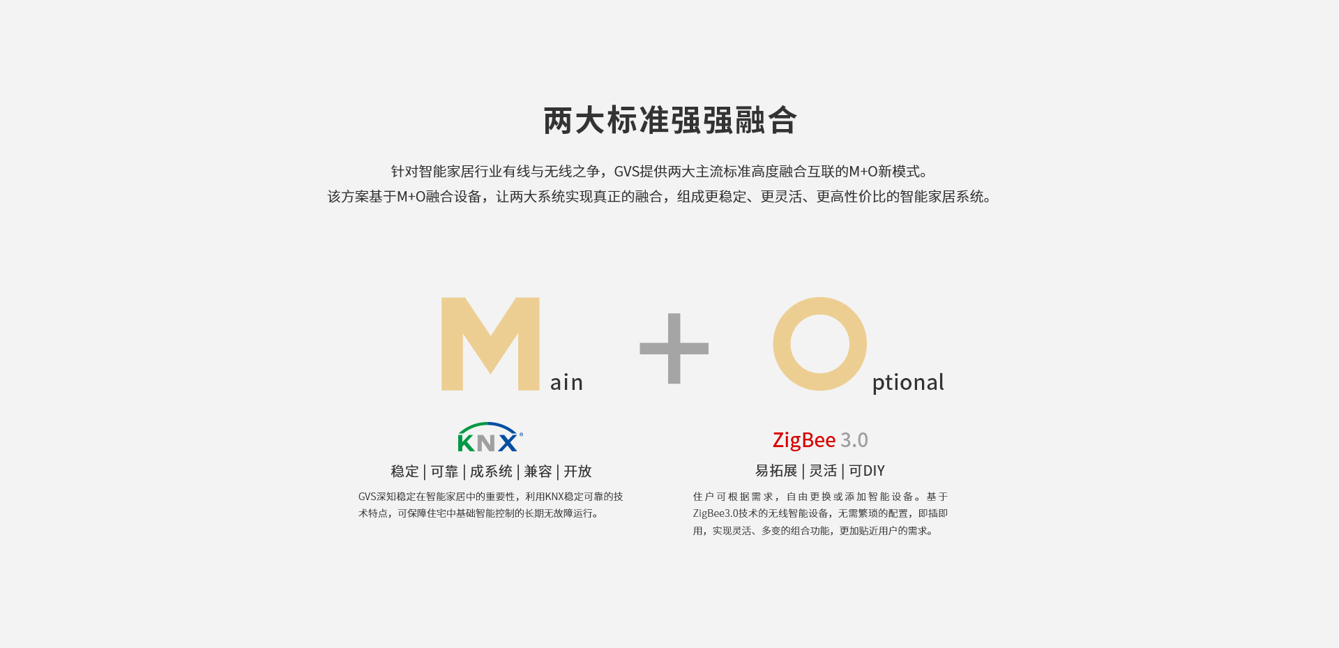 針對智能家居行業(yè)有線與無線之爭,GVS提供兩大主流標(biāo)準(zhǔn)高度融合互聯(lián)的M+O新模式。該方案基于M+O融合設(shè)備,讓兩大系統(tǒng)實(shí)現(xiàn)真正的融合,組成更穩(wěn)定、更靈活、更高性價(jià)比的智能家居系統(tǒng)。