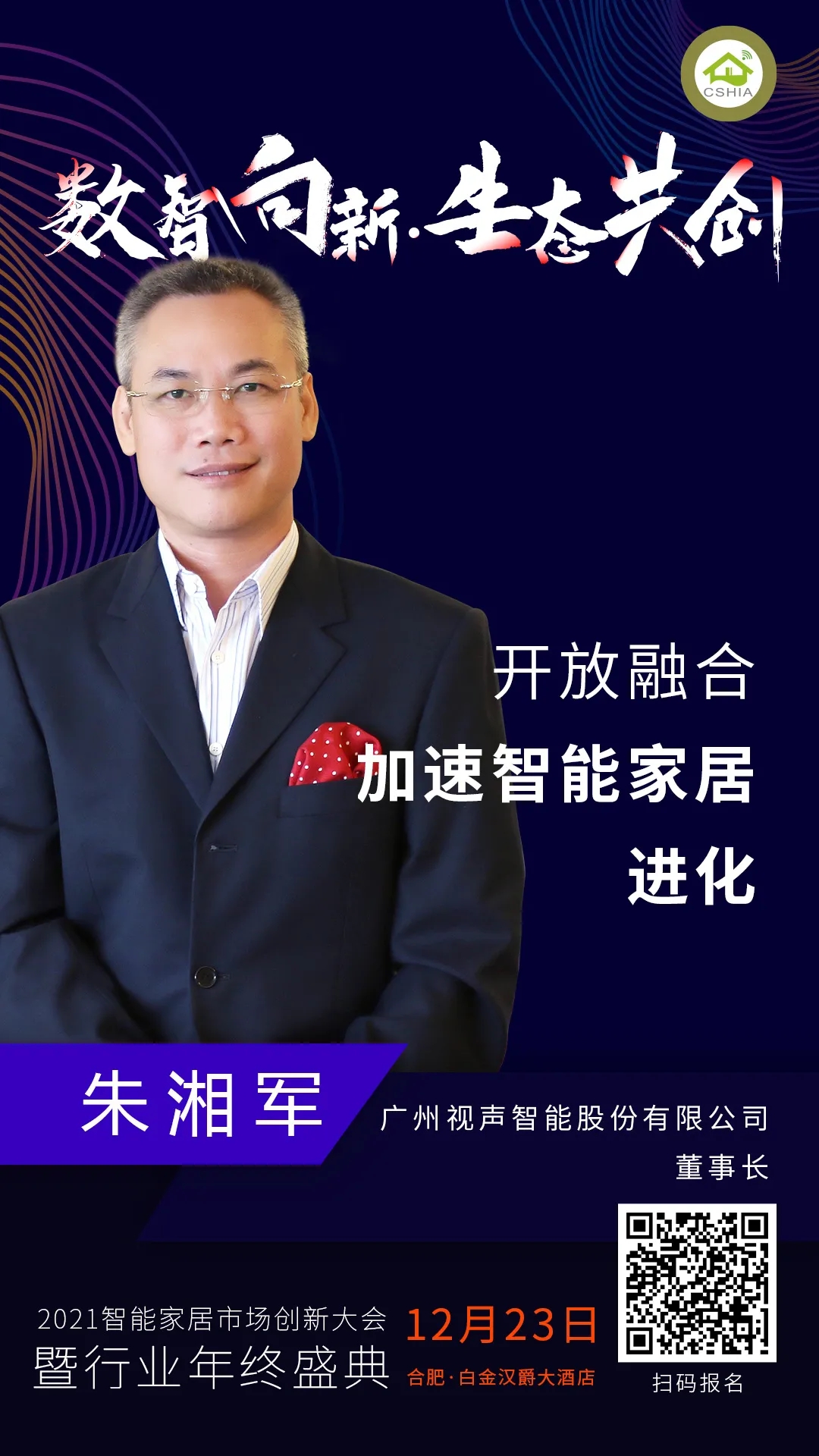 2021智能家居市場(chǎng)創(chuàng)新大會(huì)暨行業(yè)年終盛典,廣州視聲智能股份有限公司董事長(zhǎng)朱湘軍先生將出席大會(huì),并帶來《開放融合,加速智能家居行業(yè)進(jìn)化》主題演講。
