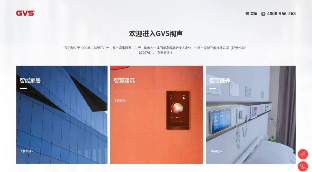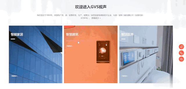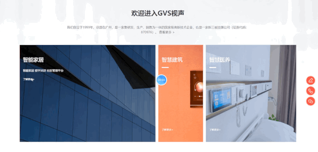 歡迎來到GVS視聲,很多關注視聲的朋友都知道,我們的服務布局3個領域:智能家居、智慧建筑和智慧醫(yī)養(yǎng)。為了方便大家可以更快地查找相關業(yè)務內(nèi)容,我們在首頁就設置了3個入口,非常直觀,非常簡單,非常好找。